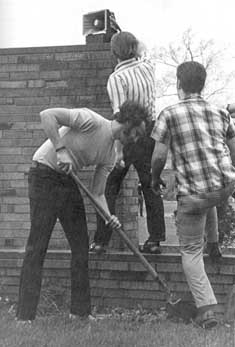 E.Ruffner teargas-Akron Beacon Journal back and forth-KSU News Service veranda-KSU News Service aimed their weapons-Howard E. Ruffner ordered-Howard E. Ruffner retreat-KSU News Service marched-John P. Filo glance back-John P. Filo crest-John P. Filo turned-Howard E. Ruffner fired-John A. Darrell, Jr. Map-May 4 Memorial brochure |
